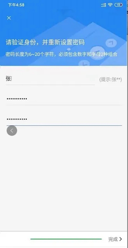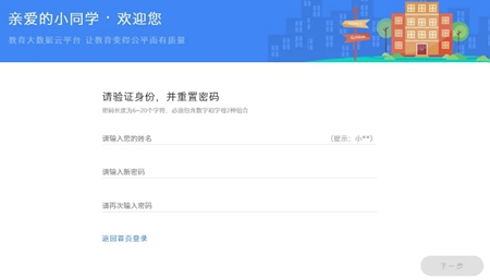 (2)通过学校下发的学生账号、密码,第一次登录需要进行初始化设置,初始化设置需验证身份,填写姓名、输入新密码,点击“下一步”完成。