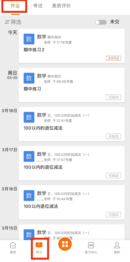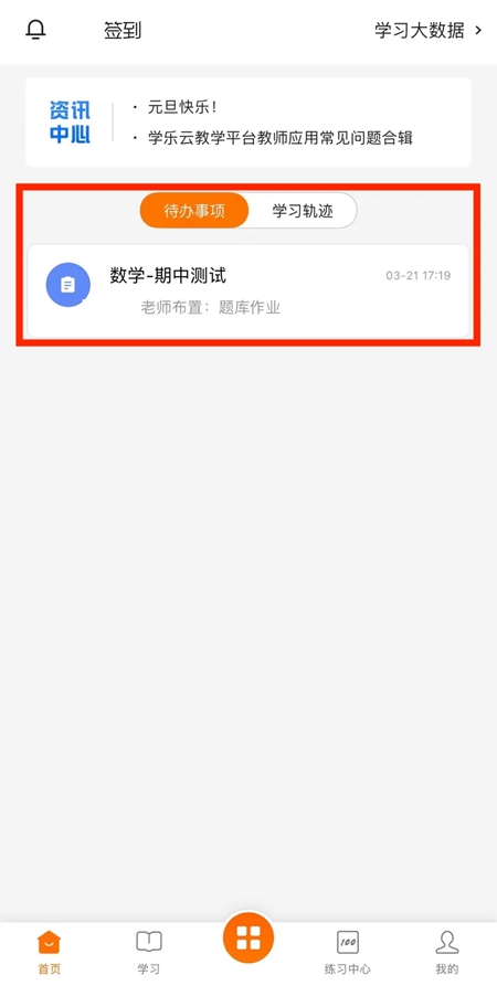 (1)打开【学乐云教学】APP后,可以通过首页的“待办事项”、“学习”-“作业”页面,查到需要完成的作业。