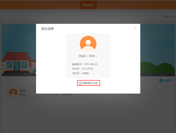 在家庭信息中找到本人的标签并点击,在弹出窗口中点击“解除家长关系”即可。