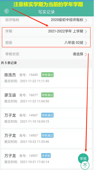 6、注意核实学期为当前的学年学期-选择授课班级-点击审核