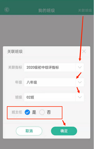 4、点击关联班级-选择自己所带的年级-班级-如果是该班班主任-点击是-如果不是则点否-点击确定。(一个班级只能设置一个班主任)