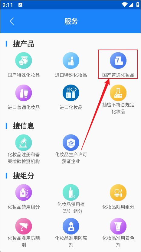 2、然后再搜产品那一栏目根据自己需要查验的化妆品进行选择,这里选择【国产普通化妆品查验】