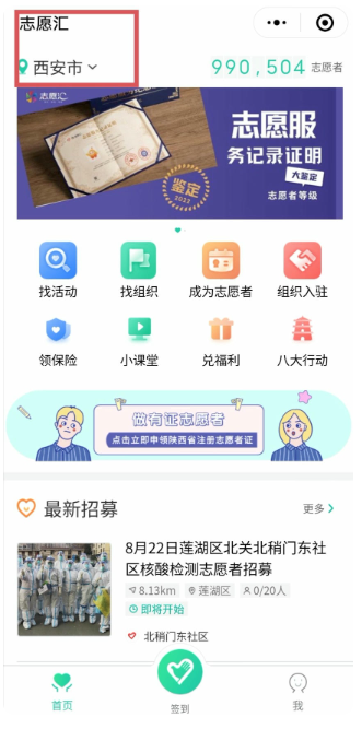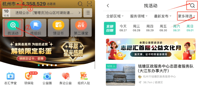 1.点击首页左上角,确认所在城市,点击“找活动”,通过搜索、筛选自己想参与的志愿服务活动