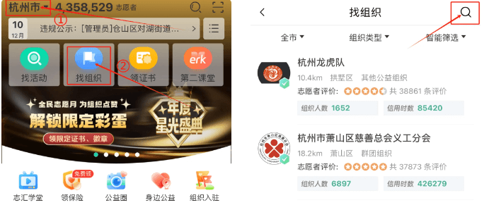 1.点击首页左上角,确认所在城市,点击“找组织”,搜索查找自己想加入的志愿服务组织(学校)名称
