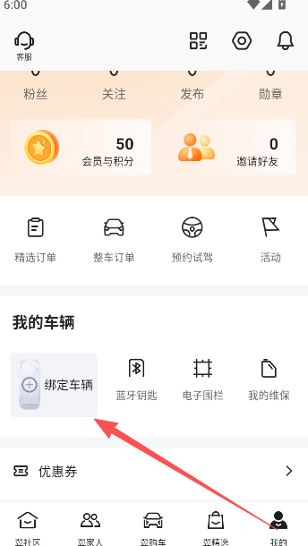 3、完成此项步骤并设置登录密码,点击用户界面的绑定车辆开始连接。