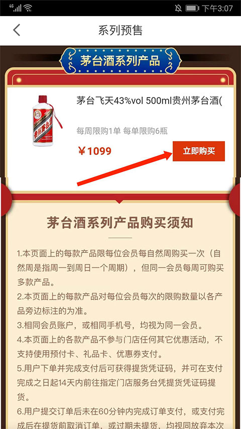 4、确认好茅台信息后,选择“立即购买”即可抢购茅台,等待开抢时间到了以后,就可以第一时间参与了。