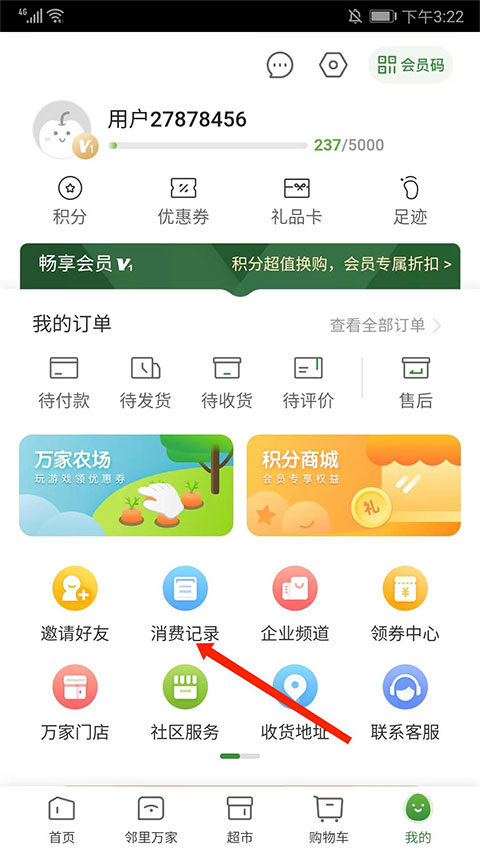 2、进入用户中心界面,选择“消费记录”图标,查看可以电子发票的订单。