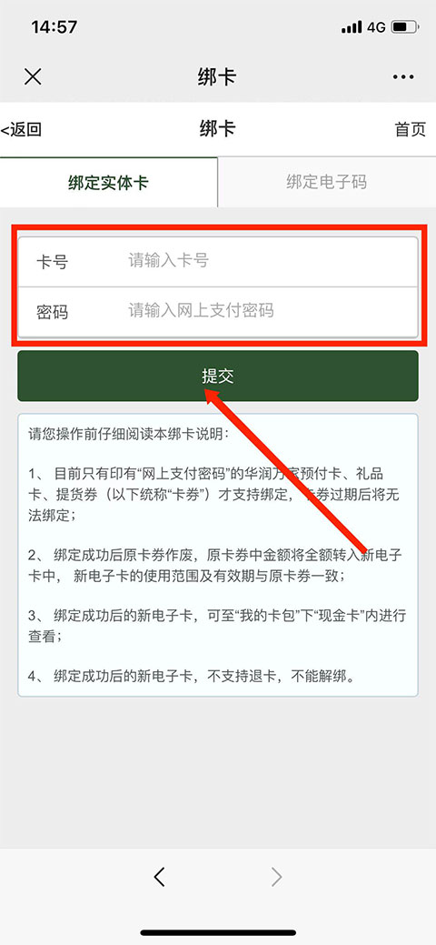 4、进入绑卡界面,填写“卡号”和“密码”后,选择“提交”即可绑定购物卡。