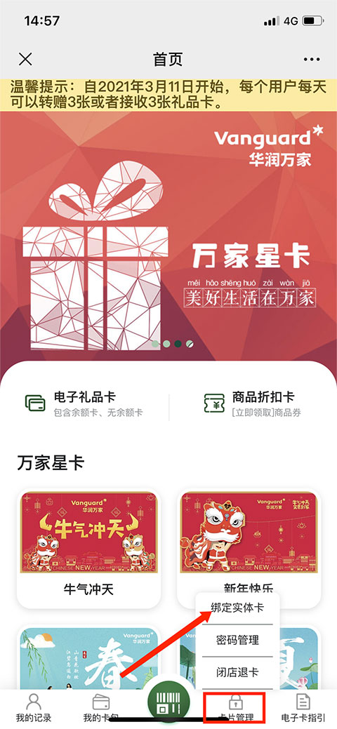 3、点击右下角“卡片管理”,然后选择“绑定实体卡”选项,开始绑定购物卡的操作。
