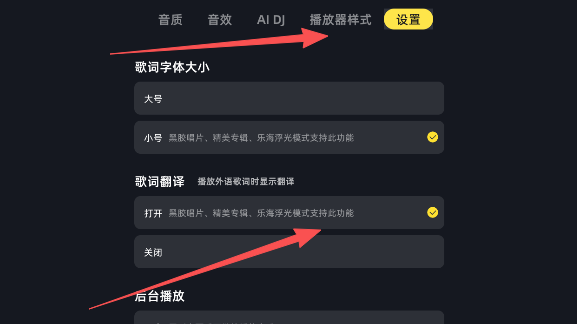 2、切换页面至最右侧,如图示点击打开歌词翻译。