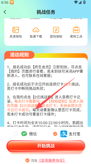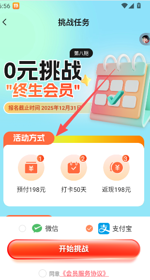 3、了解完整活动规则,通过微信或是支付宝支付活动费用,之后在指定时间以内完成任务,可永久解锁软件会员使用权限。
