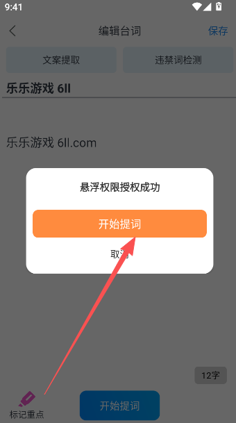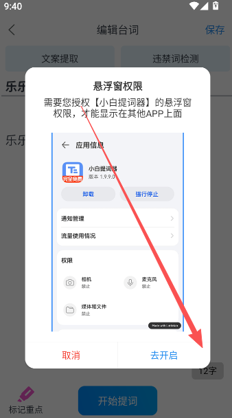 4、每次开启之前,系统都会给出对应的指示操作,蔽日悬浮提词顾名思义就是悬浮窗显示,需要应用授权悬浮权限。