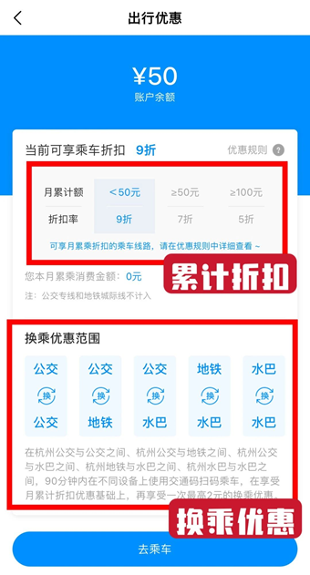 使用杭州公共交通一码通乘车,还可享受优惠活动:自然月内乘坐地铁、公交、水上巴士线路累计消费金额50元以内的,每乘次享受9折优惠;累计消费在50(含)至100元的,每乘次享受7折优惠;累计消费在100元(含)以上的,每乘次享受5折优惠。储值余额不作废。(注:公交专线和地铁城际线不计入优惠)。