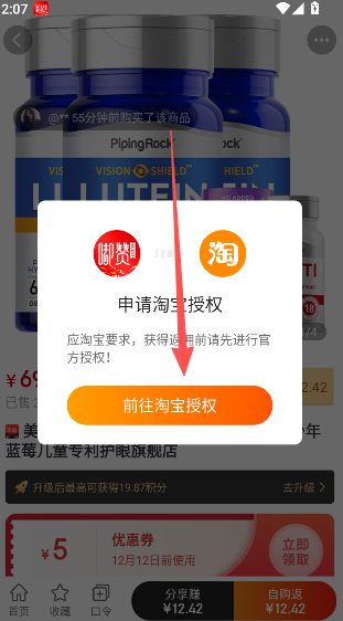 6、授权淘宝移动应用相关权限,之后就可以获得分享所得的赚取奖励啦。