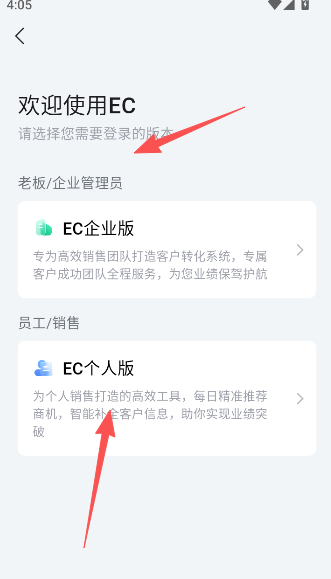 2、按身份选择使用版本,老板或是企业管理员就选择企业版,如果是个人就选择EC个人版。