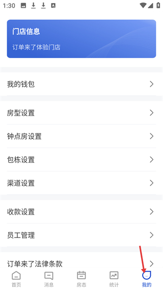 4、我的界面,显示门店信息,有多个功能选项,底部我的导航栏选中,用于管理账号及门店设置。