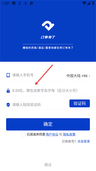1、注册界面,需输入手机号、设含数字字母的密码、填验证码,同意协议后点确定注册,也可跳过。