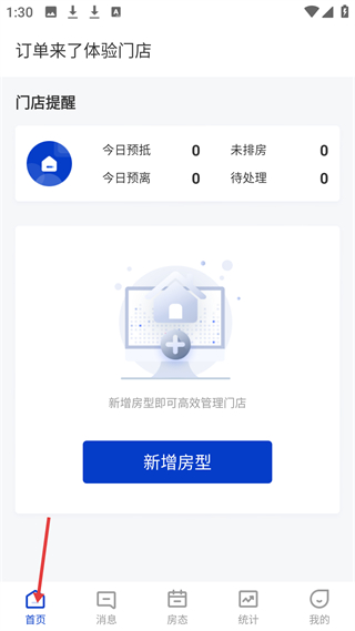 3、首页界面,显示体验门店,有门店提醒,可新增房型,底部首页导航栏选中,用于查看门店信息和操作。
