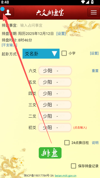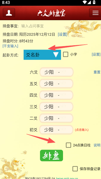 1、打开软件排盘软件界面,选择起卦方式,输入六爻时间,信息上一定要准确。