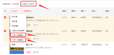 步骤三:绑定成功后,打开房源买卖列表批量操作—勾选需要上架的房源,即可对房源进行批量上架或下架