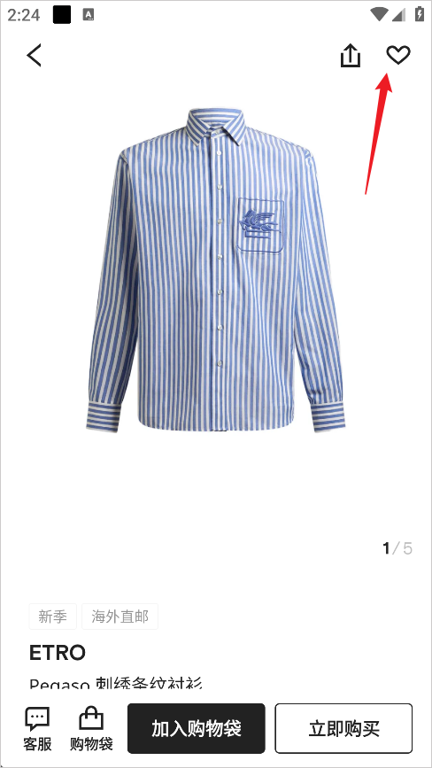 2、进入到商品详情页面,点击页面右上角的“心型”图标按钮,选择收藏。