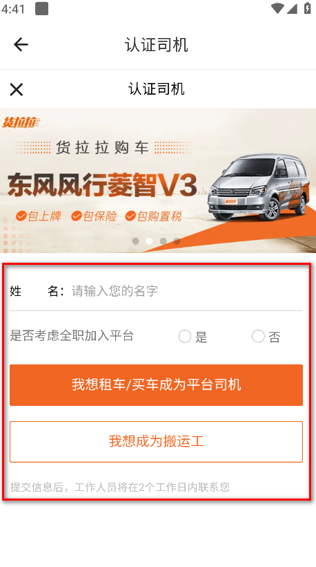 4.认真填写以下的认证司机信息,提交信息之后,就会有工作人员将在2个工作日内联系您。