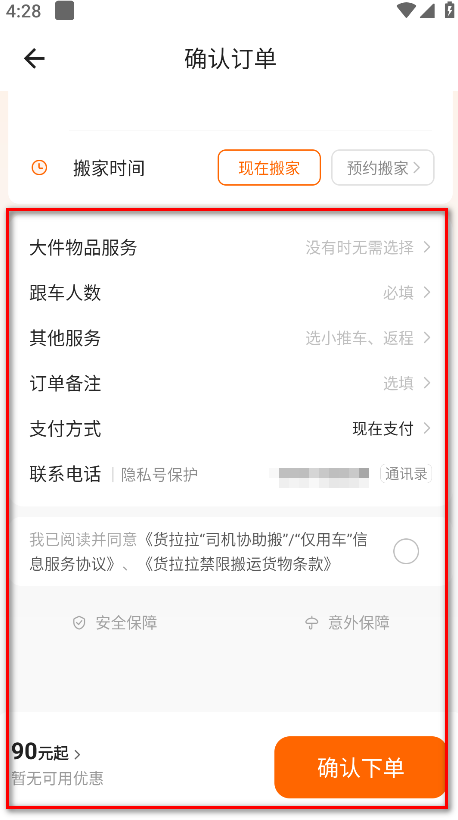 4.填写订单相关的信息,然后勾选我已阅读并同意《货拉拉“司机协助搬"/“仅用车”信息服务协议》、《货拉拉禁限搬运货物条款》,点击确认下单即可。
