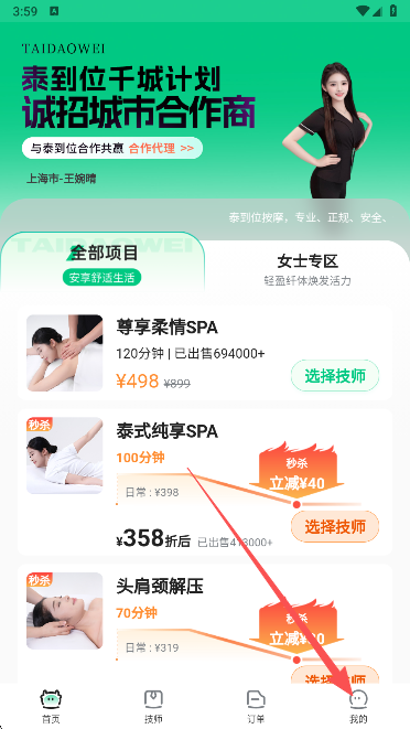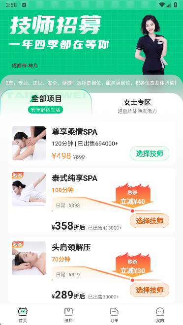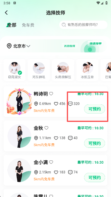 用户可轻松一键预约心仪的按摩服务项目和技师,省去繁琐的预约流程。