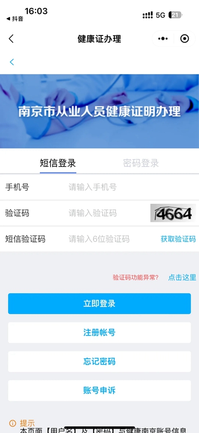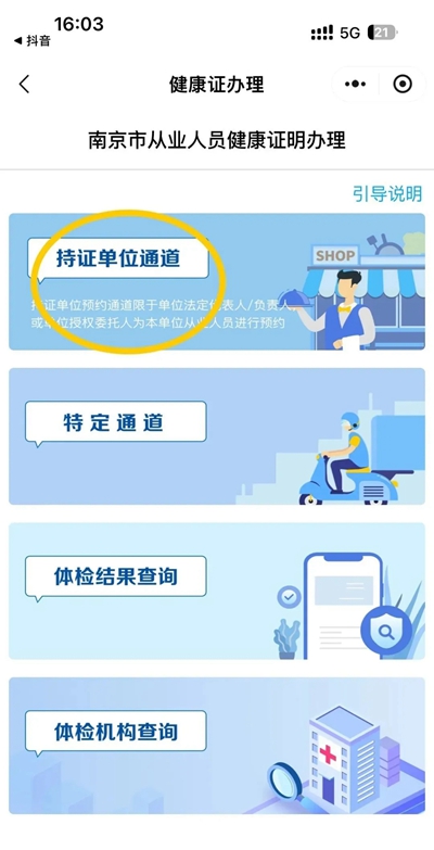 1. 微信小程序--搜索“南京市健康证明办理”或健康南京APP--“健康证体检”,登录后点击“持证单位通道”进入主界面;