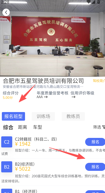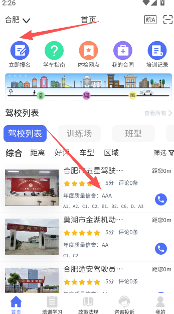 2、点击驾校列表,或是直接在上方选择立即报名。