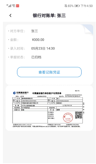 3、选择相应的记录可看到单位、金额、录入时间、单据状态和记账凭证等详细信息,