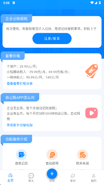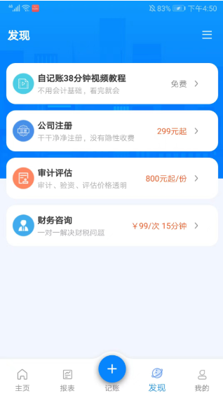 6、进入发现界面,还有视频教程、公司注册、审计评估、财务咨询等功能选项,