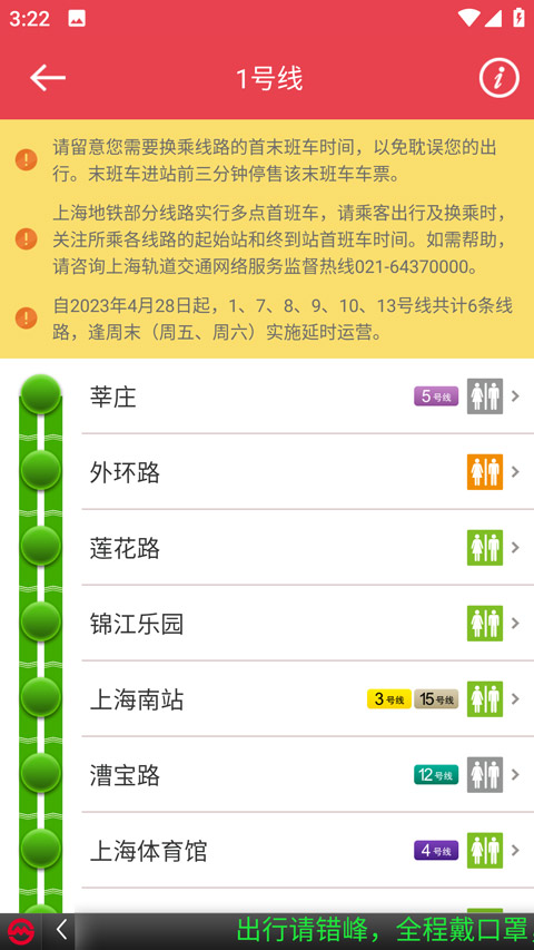 5、点击线路车站,可以查看到各路地铁会去到的站台信息,比如说这一号线,从莘庄站出发到富锦站结束,中间经过了外环路、莲花路、漕宝路等等。