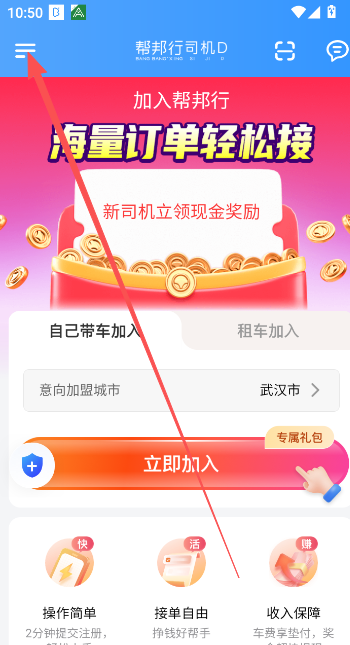 2、在用户界面选择加入的方法,是自己带车还是租车加入,并且确定好所在的网约车接单派送城市。