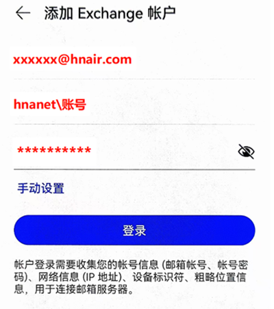 4. 也可以点击“手动设置”,参照下图详细填写配置信息,然后点击右上角?。其中服务器填写mail.hnair.com
