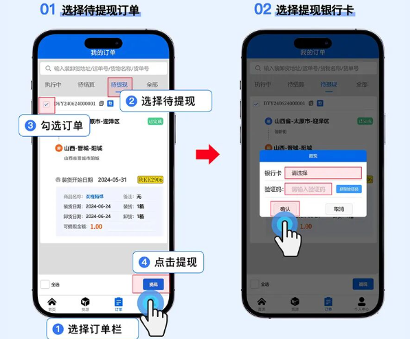 订单 》》》 待结算 》》》勾选订单 》》》提现 》》》选择银行卡 》》》提现成功 》》》验证码