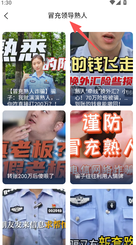 2、点击冒充领导熟人类型,进入对应反诈视频列表页面。