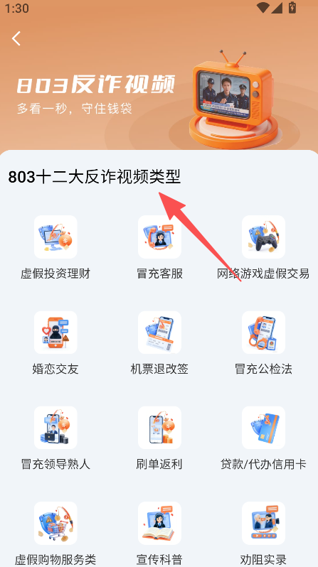 1、进入803反诈视频页面,查看十二大反诈类型分类。