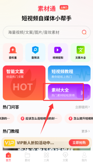 3、登录后进入首页,点击素材大全选项查看资源内容。