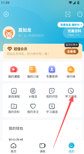 2、之后在用户界面点击我的,找打学习记录部分开始查看。