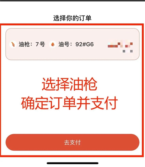 3.待油枪挂枪确定订单后,选择加油的油站和油枪号,获取并确认待支付订单。(油枪号可咨询站点工作人员)