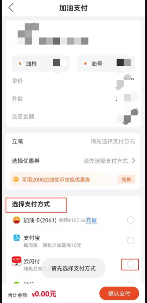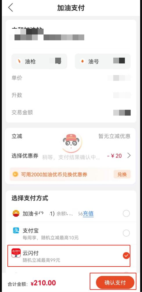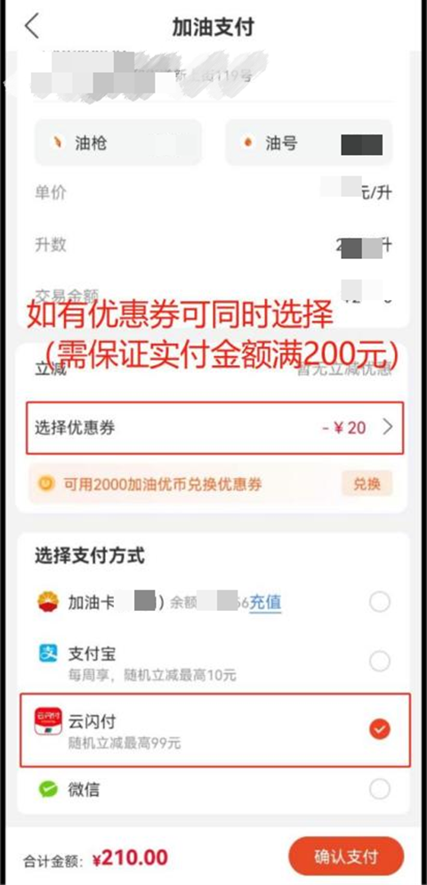 4.选择云闪付支付方式,如有APP内其他优惠可同时选择,但需保证实付金额满200元。