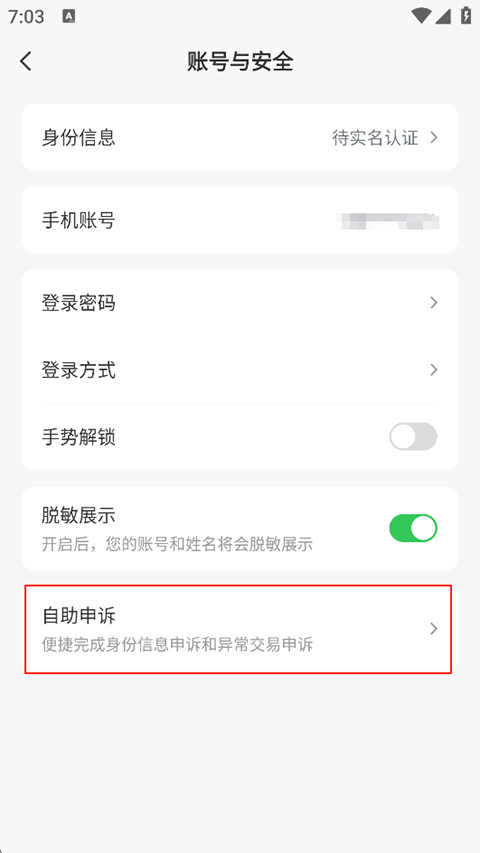 2、在这里点击自助申诉,开始就注销账号认证的事项进行反馈。