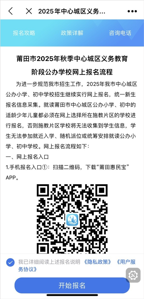 1、 进入莆田惠民宝APP首页“中小学报名”。