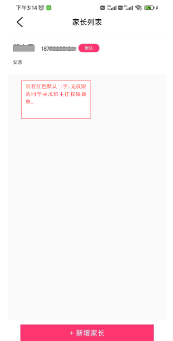 四、个人信息填写时,请留意填写家庭成员主要信息,其中监护人信息需要将其中一个设置为【默认】,该步骤可自行勾选,无权限时可以找班主任权限进行调整。