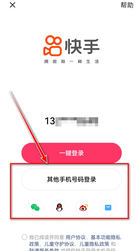 4.输入手机号码,勾选我已阅读并同意 用户协议、基本功能隐私政策、儿童守护协议、儿童隐私政策和联通服务条款并授权快手获得本机号码,点击获取验证码。