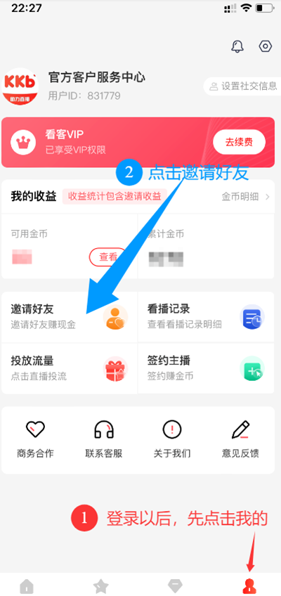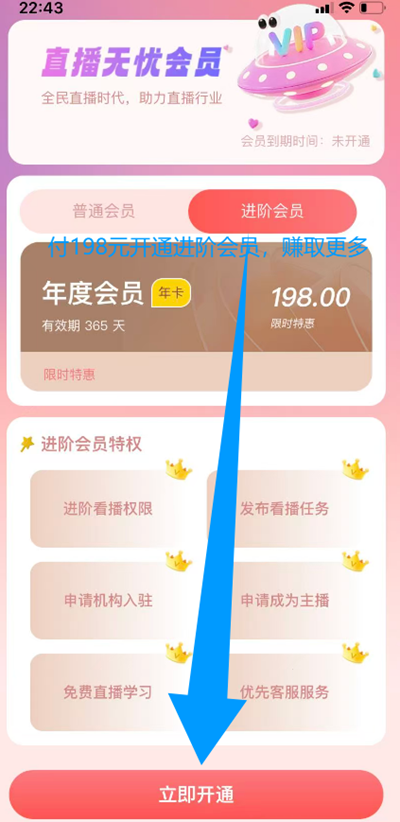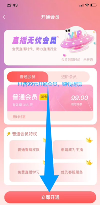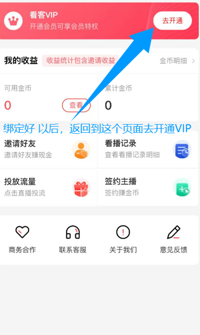 3、绑定完成以后,返回到“我的”页面,点击用户名下方的看客VIP,点击“去开通”,付费99元开通普通会员+付费198元开通进阶会员,这2步非常关键,是打开快速赚钱之路的捷径。务必开通,高速赚钱!