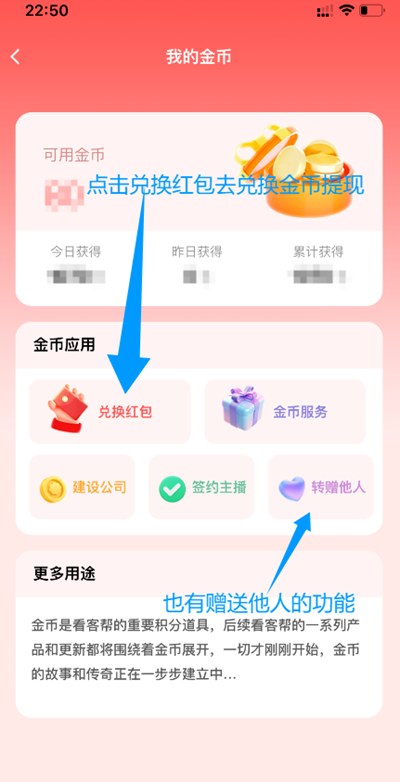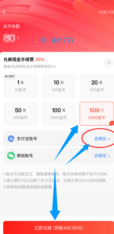 6、操作完以上第五步的看播,就会得到150个金币,然后去兑换红包,兑换以后秒到支付宝,花费99元+198元=297元即可每天得150个金币(人民币15元),297元的付出=连续得15*365天=5475元收入。每天最多可以兑换5次共计2500元人民币!