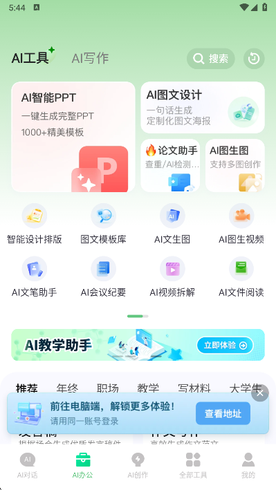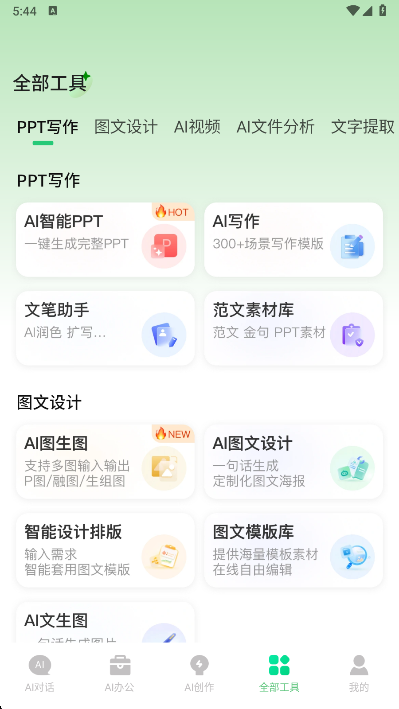 【AI办公】含AIPPT、AI录音转字(会议纪要)、AI搜索、AI文件阅读解析、范文库、PPT模板素材库、pdf格式转换、图片文字提取、图转pdf、图转word等办公工具;