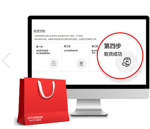 请您出境当日在指定的现代免税店取货处出示交换券,本人护照及机票换取所购商品。